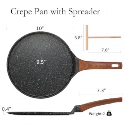 ESLITE LIFE Nonstick Crepe Pan with Spreader, 9.5 Inch Granite Coating Flat Skillet Tawa Dosa Tortilla Pan, Compatible with All Stovetops (Gas, Electric & Induction), PFOA Free, Black
