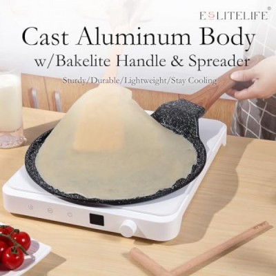ESLITE LIFE 붙지 않는 크레이프 팬(스프레더 포함), 9.5인치 화강암 코팅 플랫 프라이팬 Tawa Dosa 토르티야 팬, 모든 쿡탑과 호환 가능(가스, 전기 및 인덕션), PFOA 없음, 검