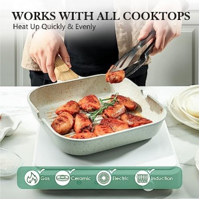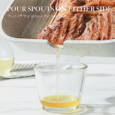 SENSARTE 스토브 상단용 붙지 않는 세라믹 그릴 팬, 쏟아지는 주둥이가 있는 다용도 사각형 그릴 팬, 모든 스토브(가스, 전기, 인덕션)용 내구성 있는 그릴 프라이팬 무독