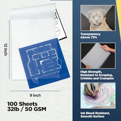 LOUPELLER 드로잉용 트레이싱 페이퍼 100매 - 9 x 12 - 32lb / 50g - 주름 방지 투명 트레이싱 페이퍼 패드 - 펜, 연필 및 마커와 함께 작동 - 예술가, 건축가 및 어린이용