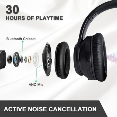 Olyre Wireless Headphones Over Ear Active Noise Cancelling Bluetooth 헤드폰 with Mic, 30시간 재생 오버헤드 Hi-Fi 스테레오 헤드폰, 부드러운 단백질 이어머프 포함 홈 오피스 PC TV AN06