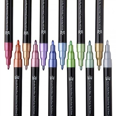 KINGART 453-12A PRO Metallic 12 Ct. Extra Fine Paint Pens, 0.7mm Tip, 12 Acrylic Paint Colors incl. Gold, Silver, Low-Odor Water-Based Quick Drying for Rock, Wood, Metal, Plastic, Glass, Ceramic