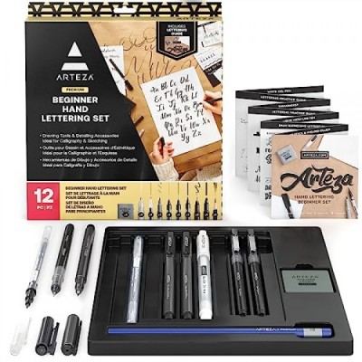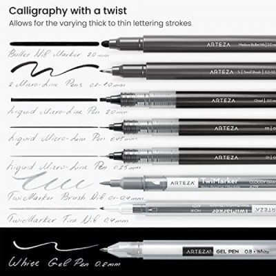 Arteza Hand Lettering Pens, 12-Piece Calligraphy Set for Beginners, 5 Micro-Line Pens, 2 TwiMarkers, Gel Pen, Bullet Marker, Pencil, & Eraser, Art Supplies with a Guidebook