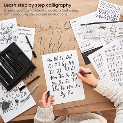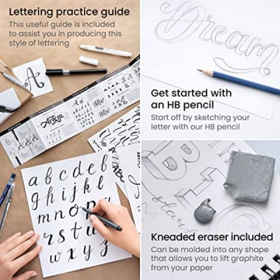 Arteza 핸드 레터링 펜, 초보자를 위한 12피스 캘리그래피 세트, 마이크로 라인 펜 5개, TwiMarker 2개, 젤펜, 불릿 마커, 연필 및 지우개, 가이드북이 포함된 미술 용품