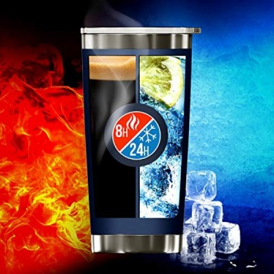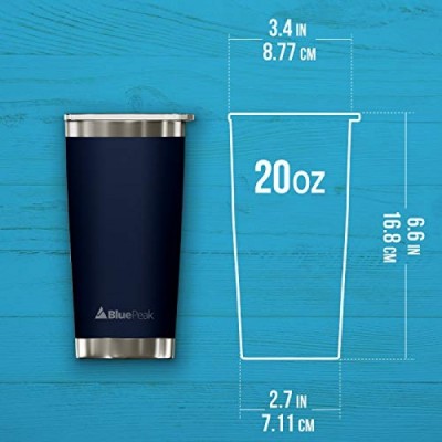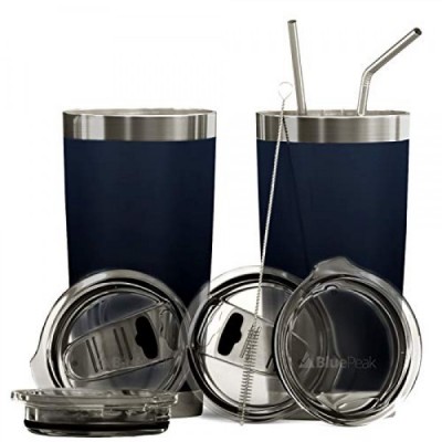BluePeak 이중벽 스테인레스 스틸 단열 텀블러 세트, 2팩, 홀짝 뚜껑, 유출 방지 슬라이딩 뚜껑, 빨대, 청소용 브러시 및 선물 상자(20온스, 네이비) 포함
