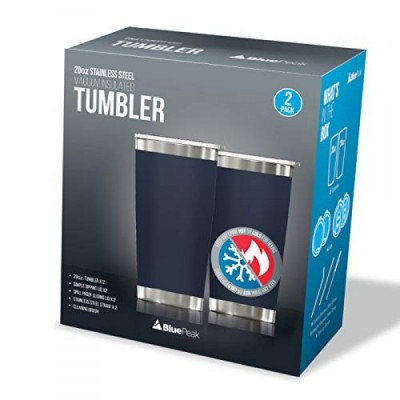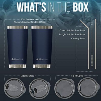BluePeak Double Wall Stainless Steel Insulated Tumbler Set, 2-Pack, Includes Sipping Lids, Spill-Proof Sliding Lids, Straws, Cleaning Brush & Gift Box (20oz, Navy)