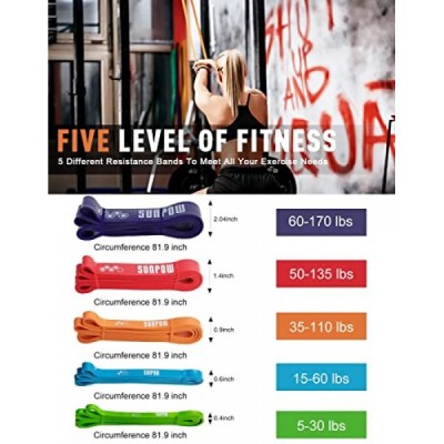 SUNPOW 풀업 보조 밴드 - 5개 및 3개 저항 헤비 듀티 운동 운동 크로스핏 스트레치 피트니스 밴드 보조 세트(신체용), 지침 가이드 및 휴대용 가방 포함