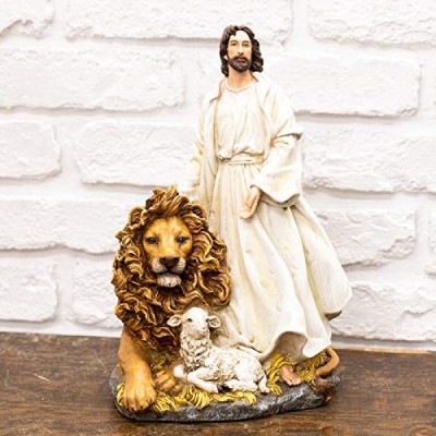 Joseph's Studio by Roman - 예수와 사자와 양 그림, 르네상스 컬렉션, 12" H, 수지 및 석재, 종교 선물, 장식, 수집, 내구성, 오래 지속