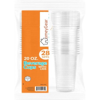 [20 oz 28 Sets] Clear Plastic Cups with Flat Straw Slotted Lids, 28 ct., Disposable and Recyclable Drinkware for Iced Coffee, Smoothies, Water, or Desserts, Large BPA Free Drinking Use 20 Oz