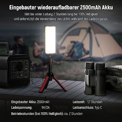 - 내장형 충전식 배터리: RGB 조명에는 내장형 충전식 2500mAh 리튬 배터리가 장착되어 있으며, 완전히 충전되면 최대 2시간 동안 100% 밝기를 제공합니다. 뒷면에 USB 타입 C 충전 포트가 있어 포함된 USB 케이블과 충전기(별매)를 통해 1.7시간 이내에 라이트를 완전히 충전할 수 있습니다. 이동 중에도 휴대용 충전기나 5V 2A USB 소켓으로 충전할 수 있습니다.