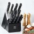 포함된 구성 요소: 4" 껍질 벗기기 칼, 5" 톱니 모양의 만능 칼, 5.5" HE 산토쿠 칼, 8" 셰프 칼, 8" 빵 칼, 8" 조각 칼, 4.5" 스테이크 칼(수량: 8), 주방용 가위, 날카롭게 하는 모듈 칼 블록