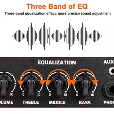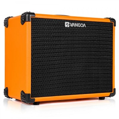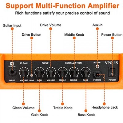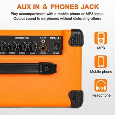일렉트릭 기타 연습 앰프, 콤보 일렉트릭 기타 앰프 15W, 3밴드 이퀄라이제이션, 6.5″스피커, 헤드폰 출력, 일렉트릭 기타 및 베이스용, 경량 및 휴대용, 주황색, Vangoa