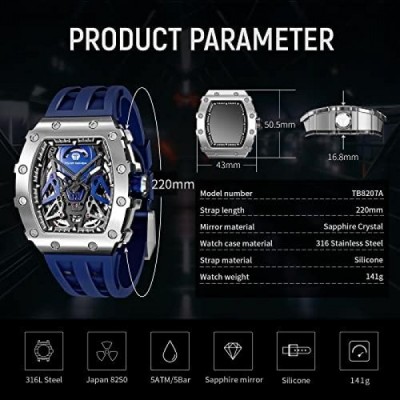 TSAR BOMBA Men's Watch Waterproof 5ATM Automatic Mechanical Analogue Wrist Watches Fashion Luxury Luminous Men's Watches with Black Silver Stainless Steel Sapphire Glass Silicone Strap Men's Watch