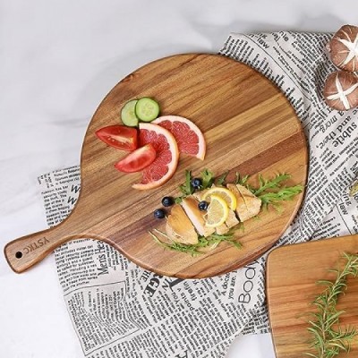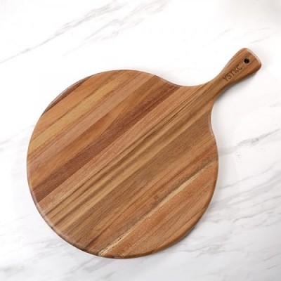 YSTKC Acacia Wood Round Cutting Board with Handle 14" x 10" Inch, Wooden Round Pizza Paddle, Cutting Serving Chopping Board for Kitchen Home Baking, Cheese, Fruits, Vegetables, Bread, Charcuterie