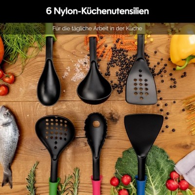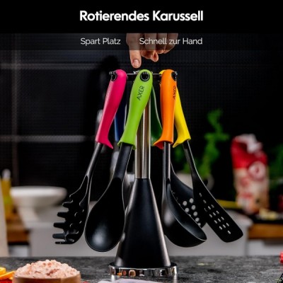 Axer Nylon-Kochutensilien-Set mit Drehbarem Ständer – 6-teilig – Mehrfarbiges Küchenset mit Löffel Schöpfkelle Schaumlöffel Wender Pfannenwender und Spaghettilöffel – Spülmaschinenfest