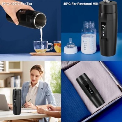 Rauwseul 여행용 전기 주전자 소형, 304 스테인레스 스틸 라이너가 포함된 350 ml 휴대용 가열 컵, 40 ~ 100 °C 조정 가능, 300 W 빠른 끓는 물 컵, 누출 방지, 역류 방지 화재 방