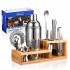 포함된 구성 요소: 맞춤형 대나무 디스플레이, 더블 지거(½OZ 및 1OZ), 산사나무 여과기, 코르크 따개, 주류 붓는 도구 2개, 강철 픽 4개, 머들러, 얼음 집게, 믹싱 스푼, 여과기가 내장된 셰이커(750ML/25OZ)