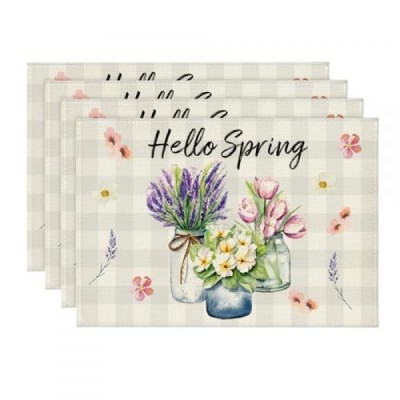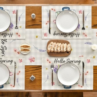 Artoid 모드 버팔로 격자 무늬 꽃 꽃병 안녕하세요 봄 식탁용 플레이스 매트, 12 x 18 인치 여름 계절 휴일 장식 소박한 빈티지 빨 테이블 매트 4개 세트