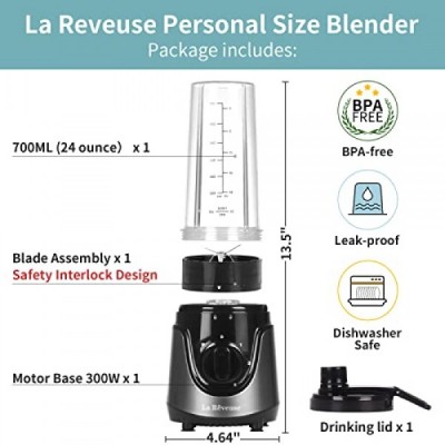 La Reveuse Personal Size Smoothies Blender 300 Watts with 24 oz BPA-Free Portable Travel Sports Bottle (Grey)