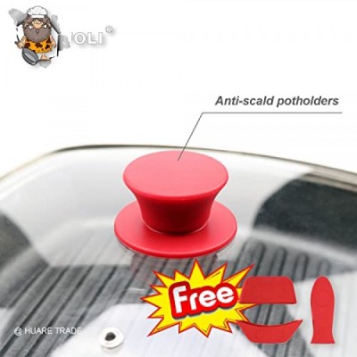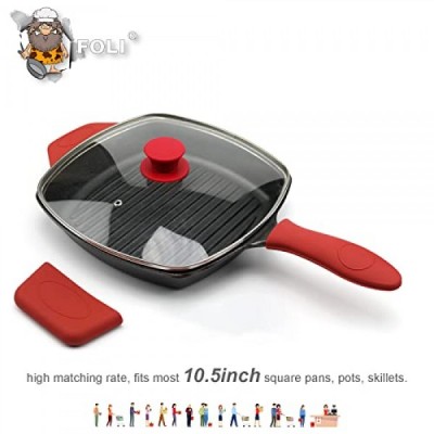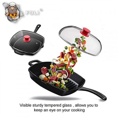 FOLI Square Glass Lid for Grill Pans with Steam Vent Hole - Fits Lodge Cast Iron Skillets 10.5inch/26.67cm Silicone Potholder- Square Tempered Glass Lid - Universal Replacement Cover Silicone Knob