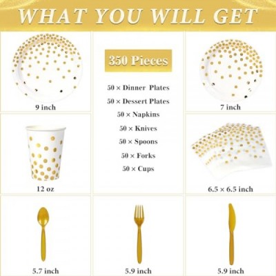 DECORLIFE 350PCS 금 접시 및 냅킨 파티 용품 50명, 흰색 및 금색 종이 접시, 약혼, 베이비 샤워, 결혼식, 생일, 집들이용 컵 포함