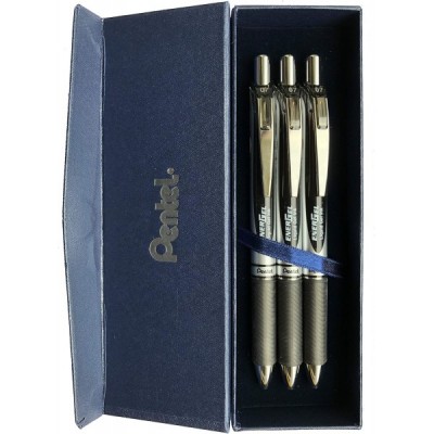 Pentel BL77 Gel-Tintenroller EnerGel mit Druckmechanik, 3 Stück schwarz + Etui in blau, 0,7mm (Geschenkset)