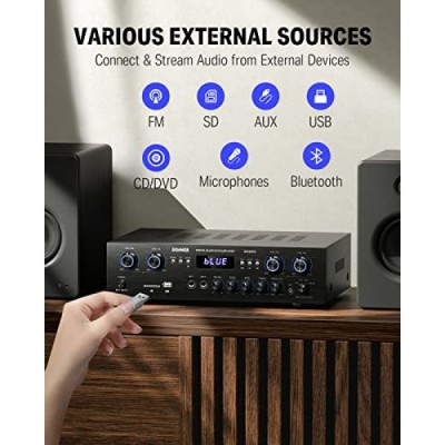 오디오 전력 증폭기 Bluetooth 5.0, Donner 440W 오디오 증폭기 4채널, 스테레오 수신기(USB, SD, FM, 2 마이크 입력 에코, RCA, LED, 스튜디오, 홈 시네마, MAMP5용)