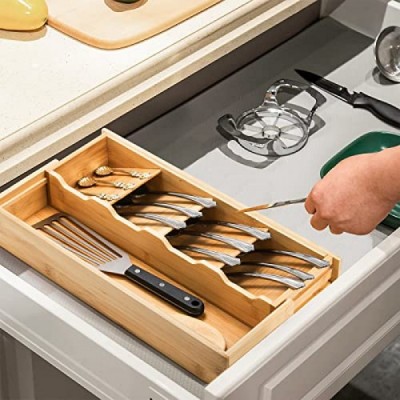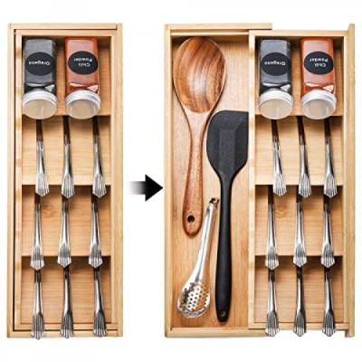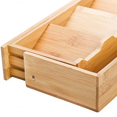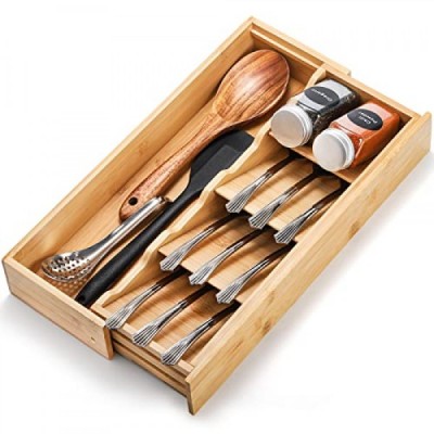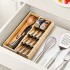 Fasmov 은식기 정리함 보관함, 대나무 컴팩트 기구 정리함, 플랫웨어 숟가락 포크를 들고 있는 주방 서랍용 칼붙이 확장형 정리함