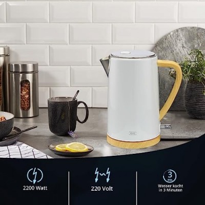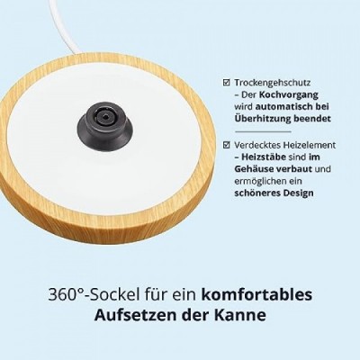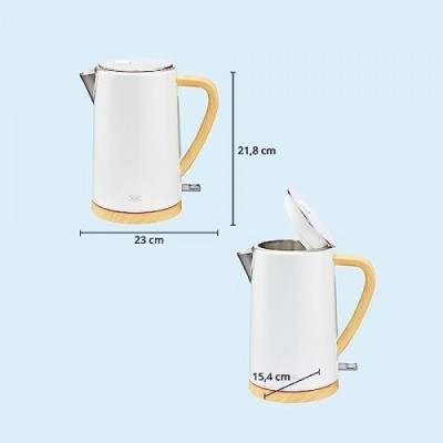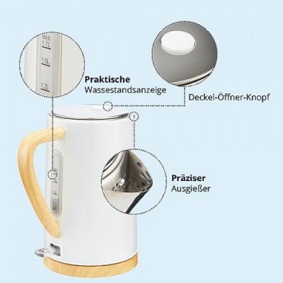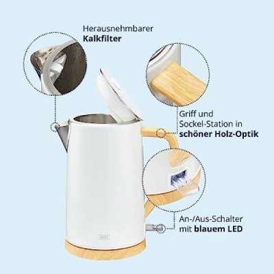 KHG Kettle WK-1716 WWD White Wood Skandi Look, Capacity 1.7 Litres, Blue LED Switch, Automatic Shut-Off, Boil Dry Protection, Limescale Filter, 360° Base, Concealed Heating Element, 2200 Watt