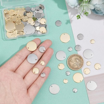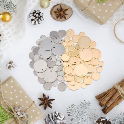 DICOSMETIC 120pcs 2 색 3 크기 7/10/16mm 빈 스탬프 펜 던 트 스탬프 태그 펜 던 트 DIY 팔찌 귀걸이 목걸이 쥬얼리에 대 한 골드 톤 스테인레스 스틸 플랫 라운드 매력 2 Colors-3 S