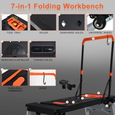 7 in 1 Folding Workbench with Wheels, Multipurpose Heavy Duty Workbench,Movable Steel Leg Free Assembly Table-550lbs Load Capacity for Surface Printed Scale & Angle Specifications(45IN)