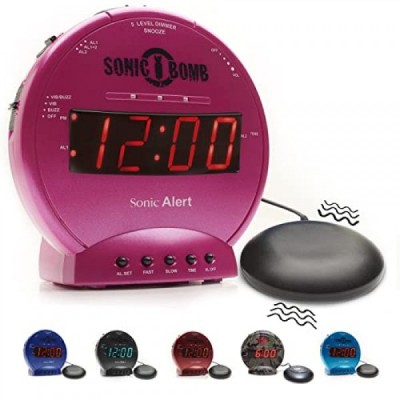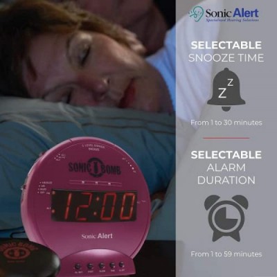 Sonic Bomb Dual Alarm Clock with Bed Shaker, Pink, Sonic Alert Vibrating Alarm Clock, Heavy Sleepers, Battery Backup, Wake with a Shake