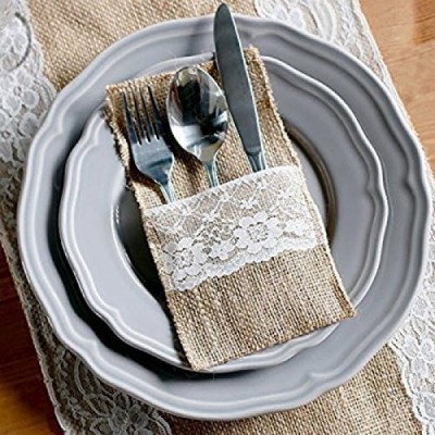 Jcevium 50 개 천연 황마 칼 붙이 칼과 포크 칼 붙이 세트 칼 붙이 가방 홀더 헤센 및 레이스 파티 웨딩 장식, 21 x 11 cm
