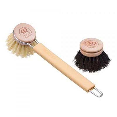 Redecker Silicone Dish Brush Bundle, Includes Interchangeable Natural Horsehair and Tampico Fiber Brush Heads, Sustainable Silicone and Stainless Steel Handle with Hanging Loop, Sand