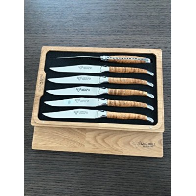 Laguiole en Aubrac Luxury Fully Forged Full Tang Stainless Steel Steak Knives 6-Piece Set with Wavy Maple Wood Handle, Stainless Steel Shiny Bolsters