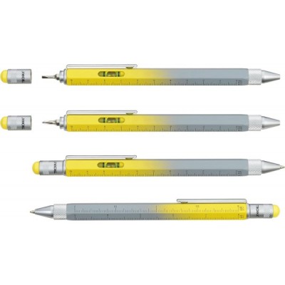 Troika Construction Multitasking Kugelschreiber, in der gelb, aus gebürstetem Messing, schwarzer Mine,mit Zentimeter-/Zoll-Lineal, 1:20/1:50 Skala, Wasserwaage, Schraubendreher, PIP20YE/GY
