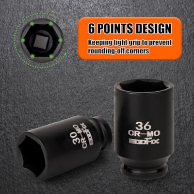 1/2 Drive Deep Impact Socket Set, 10-Piece Spindle Axle Nut Socket Set CR-MO 6 Point 30,31,32,33,34,35,36mm Metric socket, with 3/8 - 1/2 Socket Adapter Set Universal Joint Socket