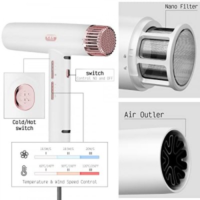 K&K Hair Dryer,Negative Ionic Blow Dryer with 110, 000 RPM Brushless Motor for Fast Drying,High-Speed Low Noise Thermo-Control Hairdryer with Nozzle,for Home,Travel (White)