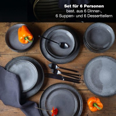 Moritz & Moritz VIDA 18-tlg. Geschirrset 6 Personen aus Keramik - Tafelservice Anthrazit - 6x Speise- Suppen-Teller, 6x Frühstücks-Teller 18-tlg Geschirr-set