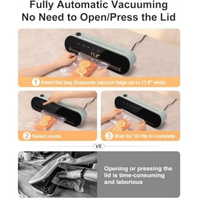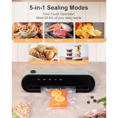 CROWNFUL Vacuum Sealer Machine, Automatic One Touch Operation Food Sealer with Dry & Moist Modes, Built-in Cutter, External Suction Tube, Removable Drip Tray, 1 Bag Rolls & 5 Pre-cut Bags (Green)