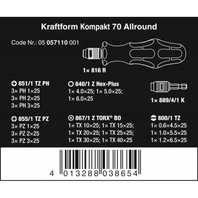 Wera Kraftform Kompakt 70 Universal Bit-Holding Screwdriver & Bit Set, PH/PZ/SL/TXBO/HEX, 32pc, 05057110001