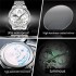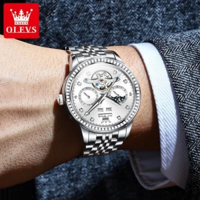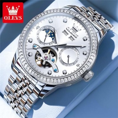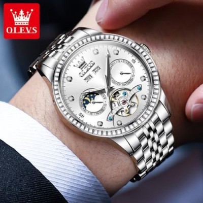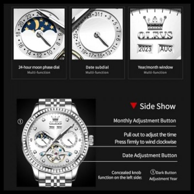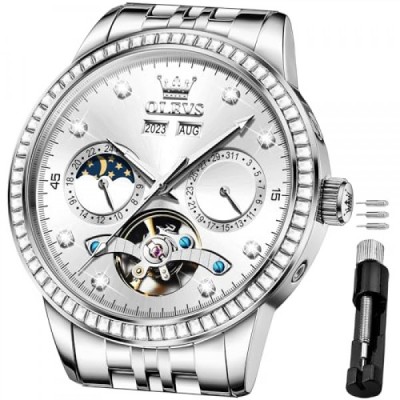 OLEVS Automatic Watches for Men Diamond Luxury Tourbillion Moon Phase Silver Stainless Steel Waterproof Luminous Classic Gentleman Men Wrist Watches Year Date Day Windows Blue White