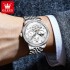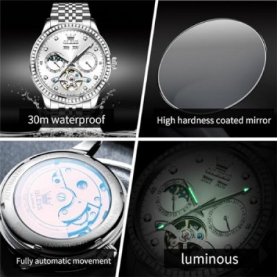 OLEVS 남성용 자동 시계 다이아몬드 럭셔리 뚜르비옹 문 페이즈 실버 스테인레스 스틸 방수 야광 클래식 신사 남성용 손목 시계 연도 요일 Windows 블루 화이트