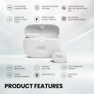 JBL Tune 130 NC TWS - 방수, 진정한 무선, 화이트 노이즈 캔슬링 인이어 헤드폰 - 최대 40시간 음악 재생 화이트 싱글