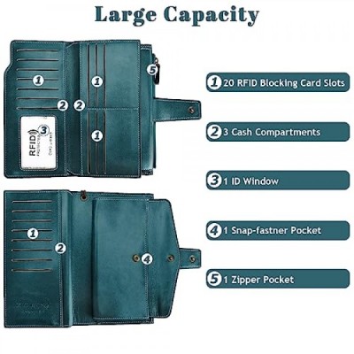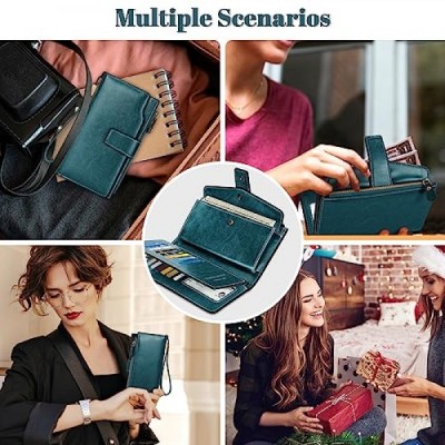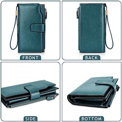 AOVNEA Women's Large Capacity Wallet with RFID Protection and Wrist Strap, Smooth and Soft Leather Wallet with Multiple Card Slots and Change Compartment, blue