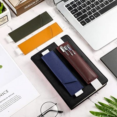 Clabby 4 Pieces Adjustable Pen Holder for Notebook Elastic Strap Band PU Leather Pen Sleeve Pouch for Hardcover Journals for Gift, 8-1.5 Inch(Green, Ginger, Red, Navy Blue)