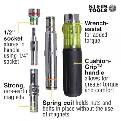 Klein Tools 32807MAG 7-in-1 너트 드라이버, 자기 드라이버에는 SAE 육각 너트 크기 1/4~9/16인치, 토크 추가를 위한 쿠션 그립 핸들 포함