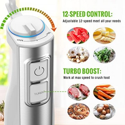 Hand Blender, 5-in-1 Multi-Purpose Immersion Blender set, 1100W 12-Speed Stick Blender, 600ml Beaker, 500ml Food Chopper, Egg Whisk, Milk Frother Attachments, White