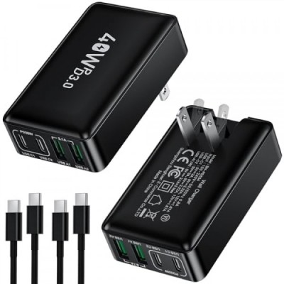 2-Pack 40W Slim Flat USB C Wall Charger with USB-C to C Cable, 4-Port Fast USB C Charger Block with Foldable Plug Double USB C&USB A Port for iPhone 15 14 13 12 Pro Max, Samsung Galaxy-Black