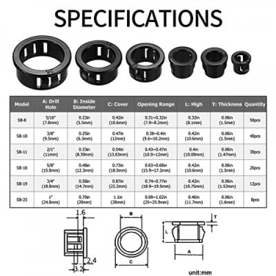 170개 케이블 스냅 부싱 그로밋, 검정색 원형 나일론 스냅인 케이블 그로밋 보호기, 5/16 3/8 1/2 5/8 3/4 1 케이블 스냅 구멍 플러그 잠금 부싱 분류 키트